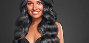Black hair woman long curly beauty cosmetic concept over black b