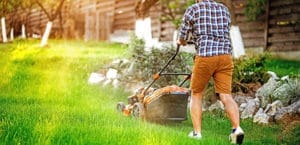 Gardener mowing the lawn using a gasoline powered device, a prof